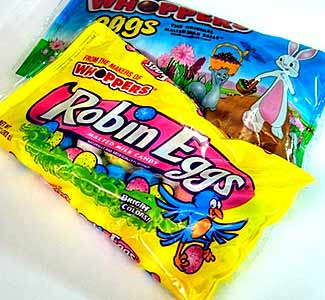 Malted eggs. My sisters called them "Alice Cooper Eggs" in that if the coating got wet it would rub off on your lips like lipstick and give you a similar look to Alice Cooper when he was performing his shows.