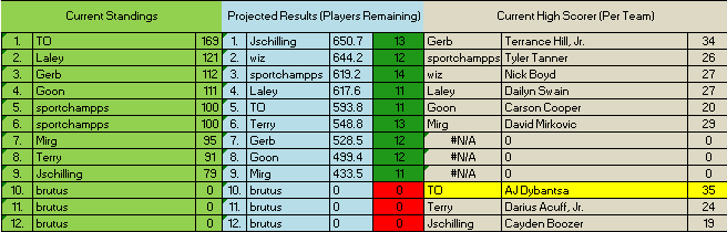 These should be accurate. Ignore Brutus auto-populating everyone (those not playing) in spots 10/11/12. Also ignore the formula (#N/A) that cannot be completed because those guys do not have any players drafted or scored (again, those not playing).