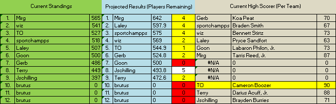 I'm so angry. I was between Stirtz and Wes Ennis in the 10th round. If I had gone Stirtz, and his 73 points instead of Ennis and his 4 points, I likely win this thing for the first time ever. Instead,...